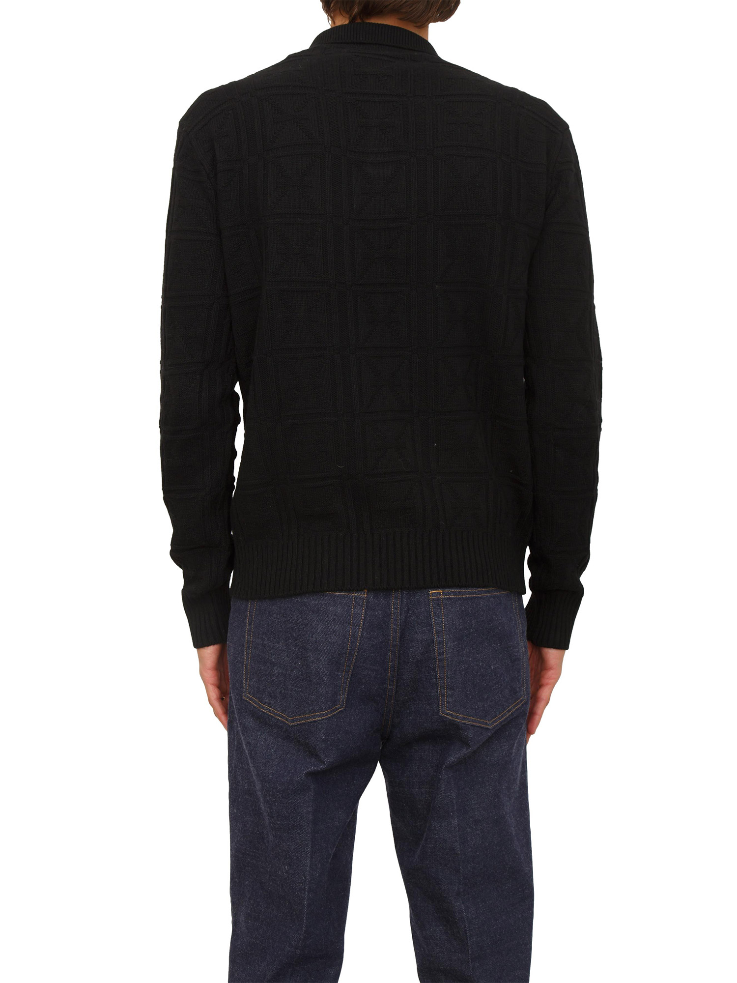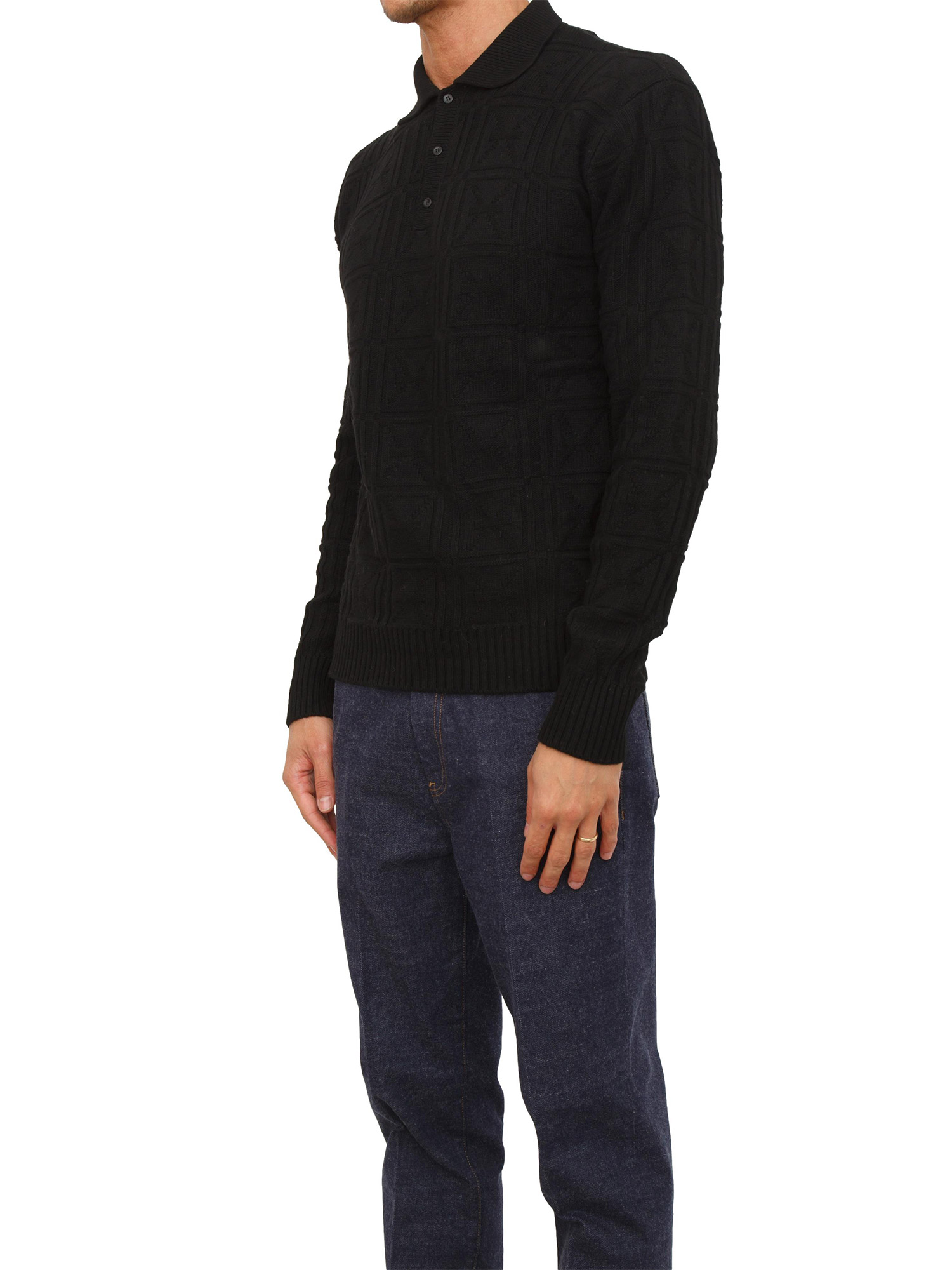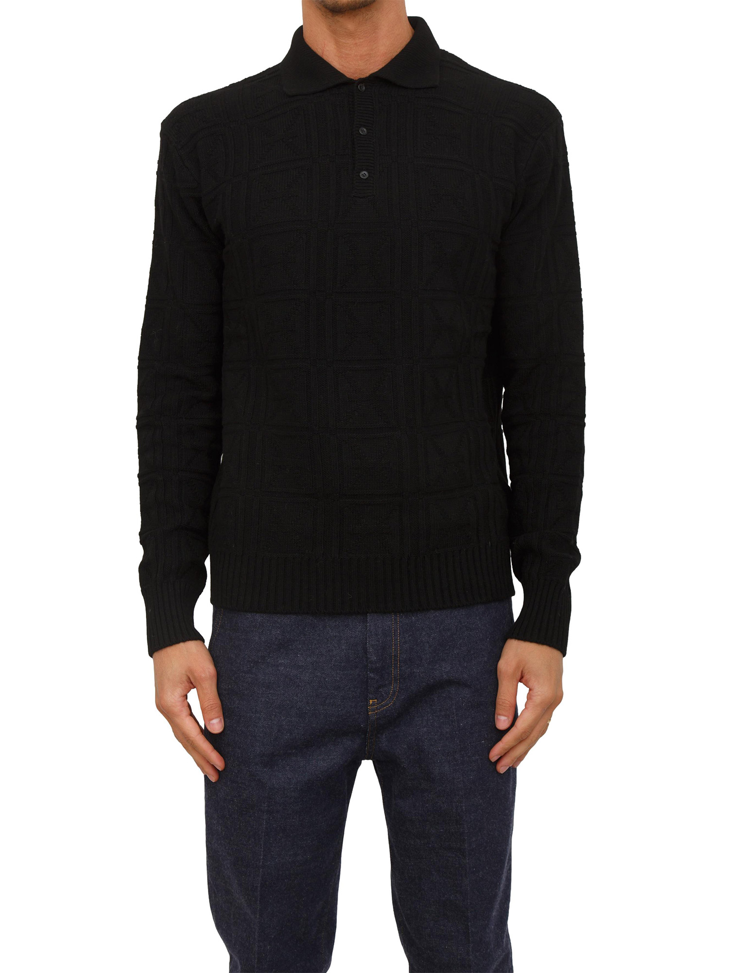 Brand: RICHMOND XMaglia polo Richmond X uomo ralizzata in lana con vestibilità regular. Design con texture a lavorazione geometrica logo all over, chiusura con tre bottoni logati e lavorazione a coste sui fondi. Il modello è alto 1.90m e indossa la taglia L.