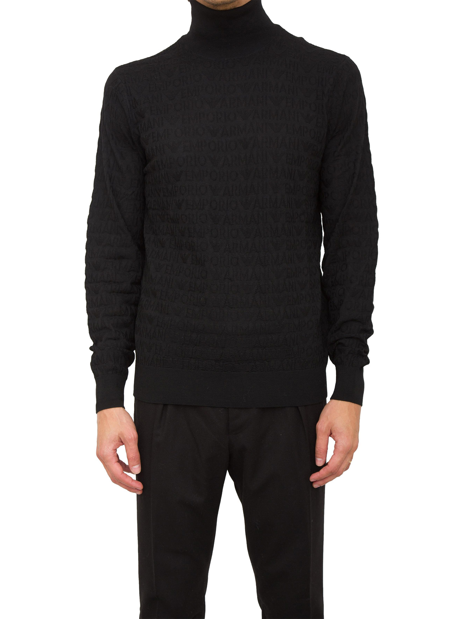 Maglione con collo dolcevita realizzato in pura lana vergine. La texture si caratterizza per la fitta fantasia a lavotazione devoré che mostra logo lettering all over. Esibito, mostrato o appena accennato, il logo di Emporio Armani rimane una costante di stile innegabile.