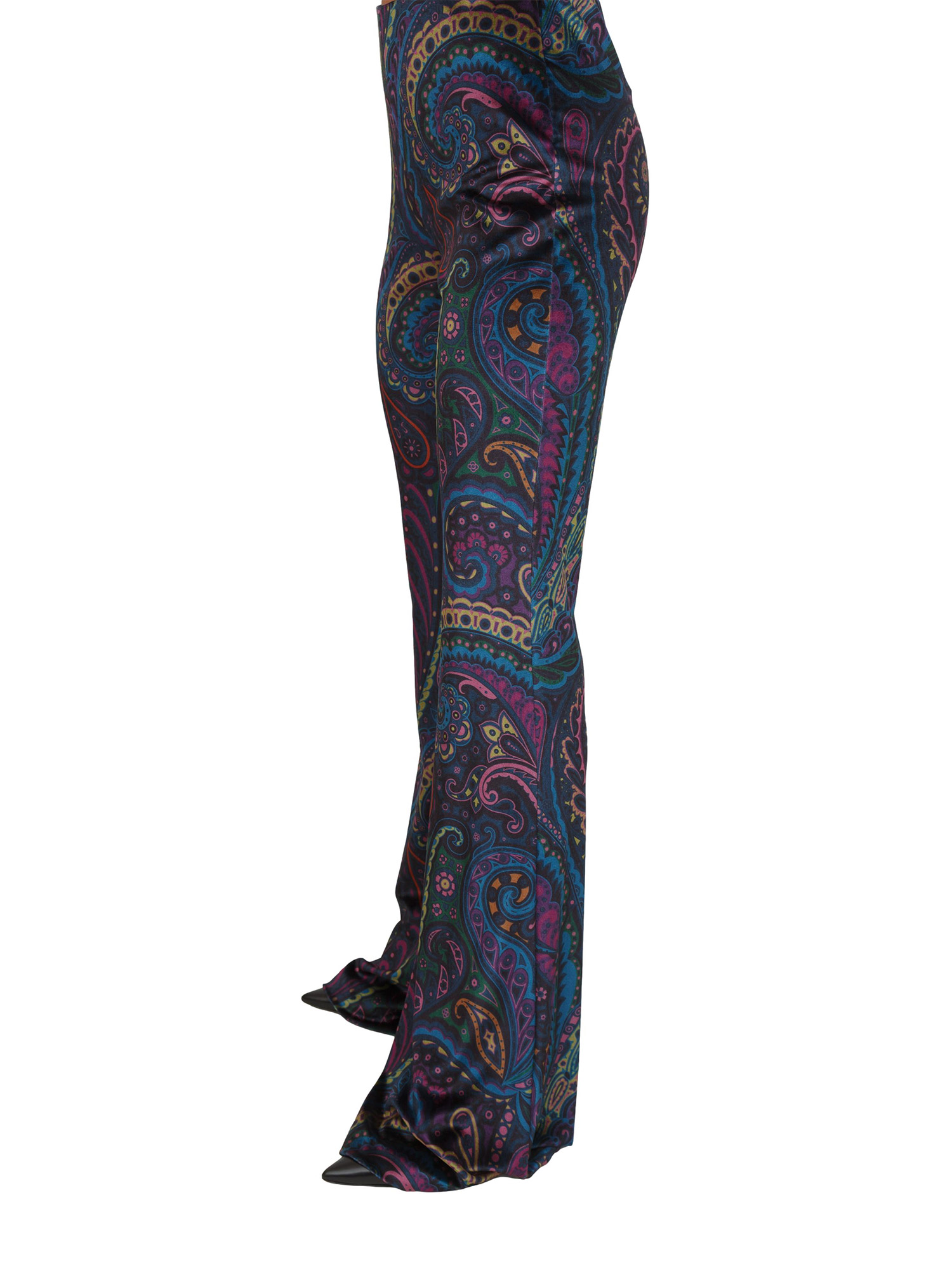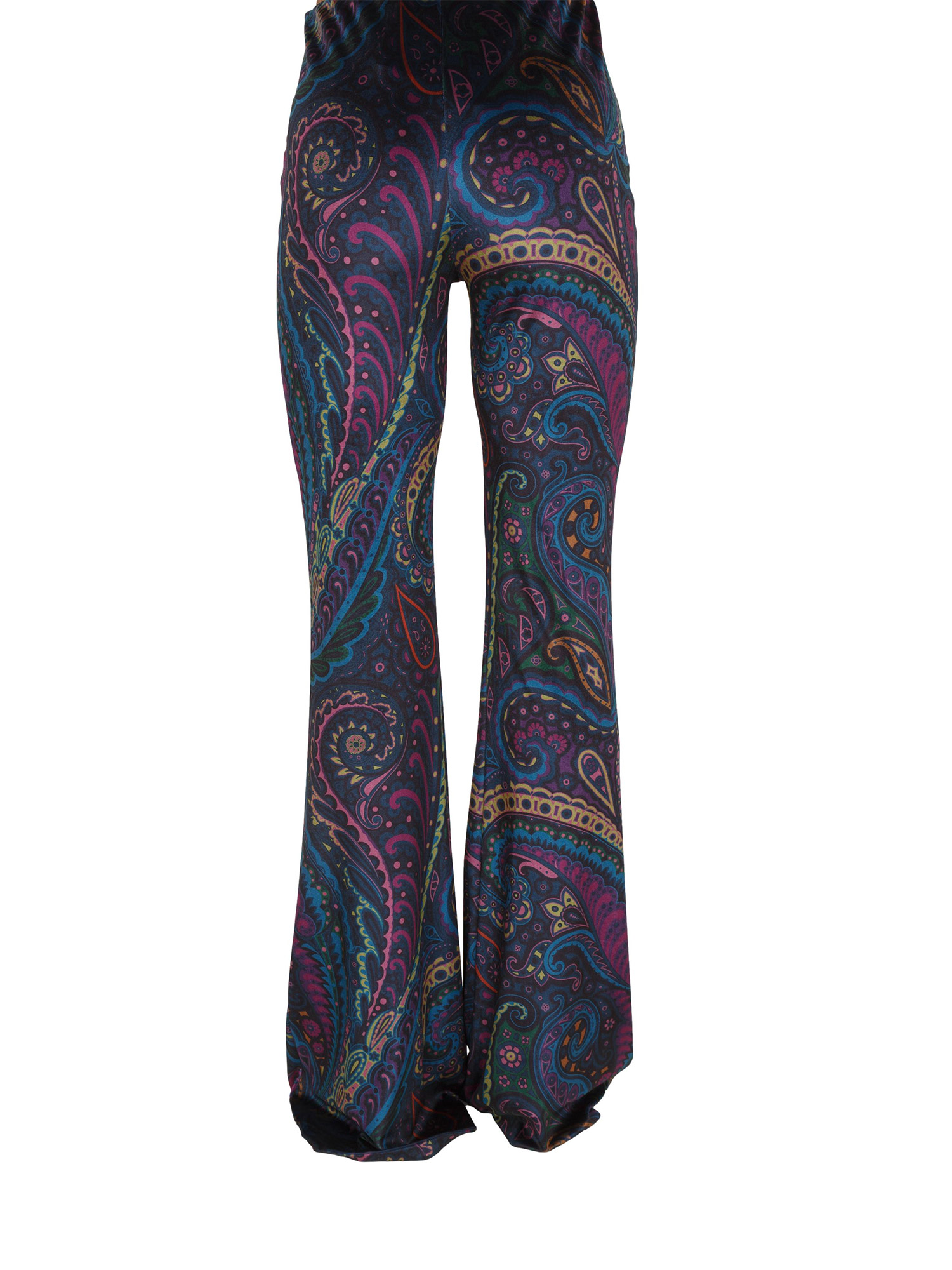 Brand: ETROPantaloni flare Etro donna dalla linea aderente sui fianchi con svasatura al fondo. Il modello è realizzato in ciniglia stretch e decorato da una stampa Paisley multicolore all over. Stupendo da indossare con la sua maglia. La modella è alta 1.72 e indossa la taglia S.