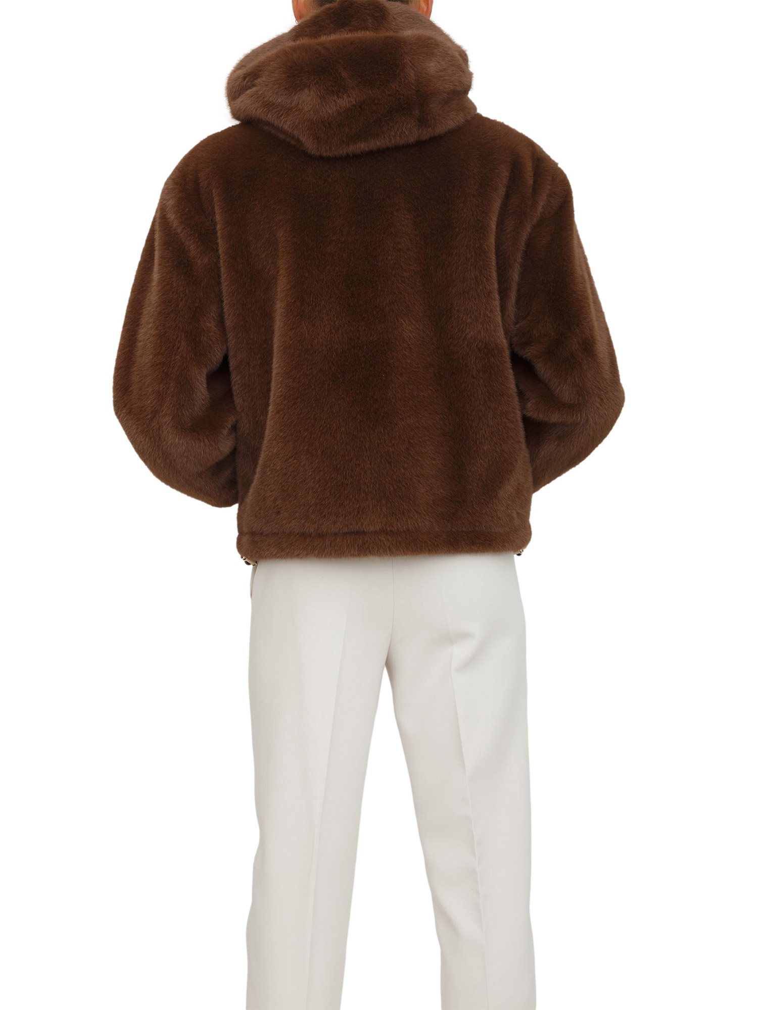 Brand: EMME MARELLAScelta glamour da indossare a ripetizione, la pelliccia Emme Marella realizzata in tessuto effetto furry liscio e morbido. Design con cappuccio, coulisse in fondo con elastico interno per un effetto bomber e tasche laterali. La modella è alta 1.72 e indossa la taglia 40.