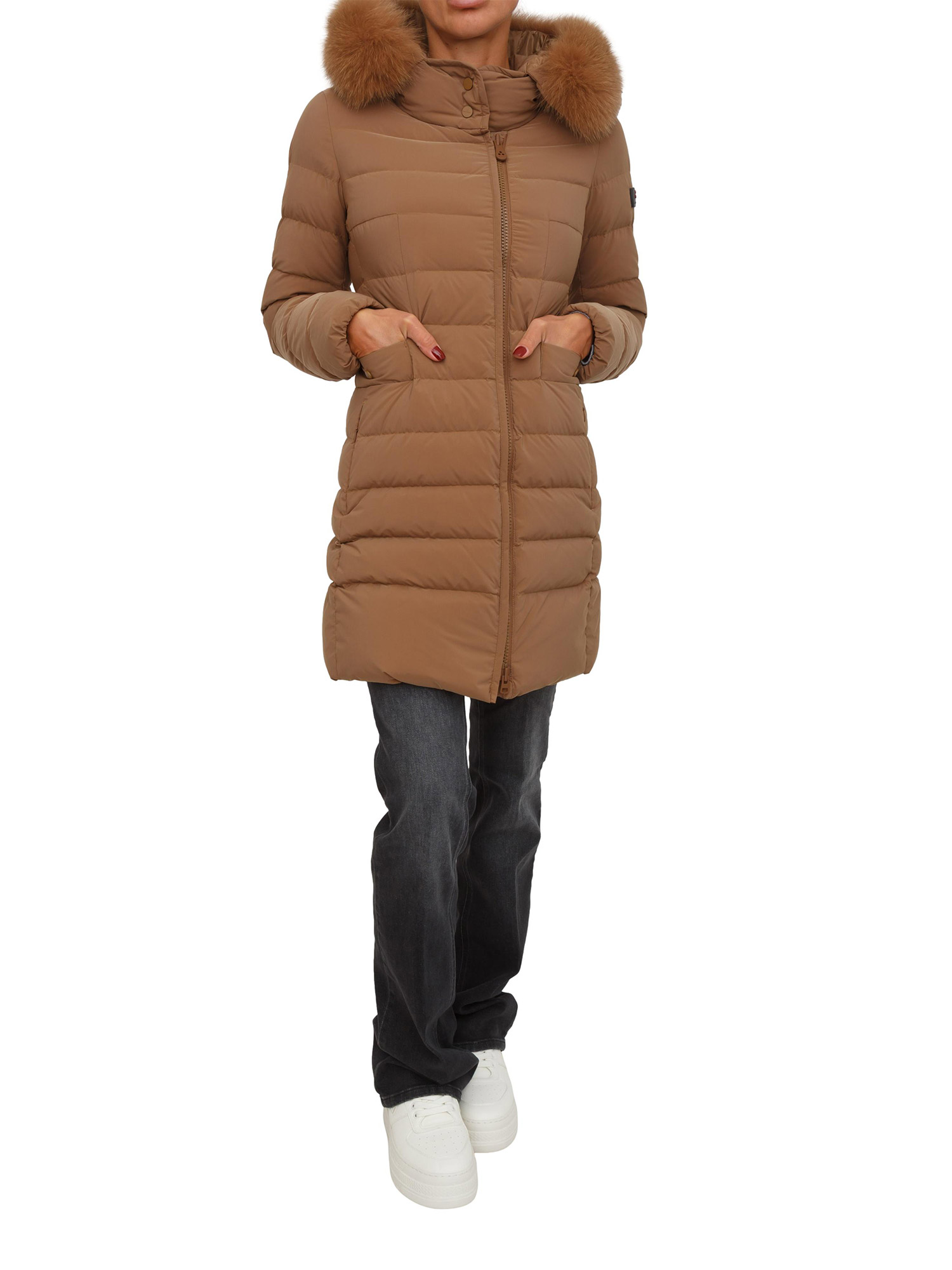 Piumino lungo marrone in piuma naturale Peuterey con collo alto e pelliccia volpe removibile