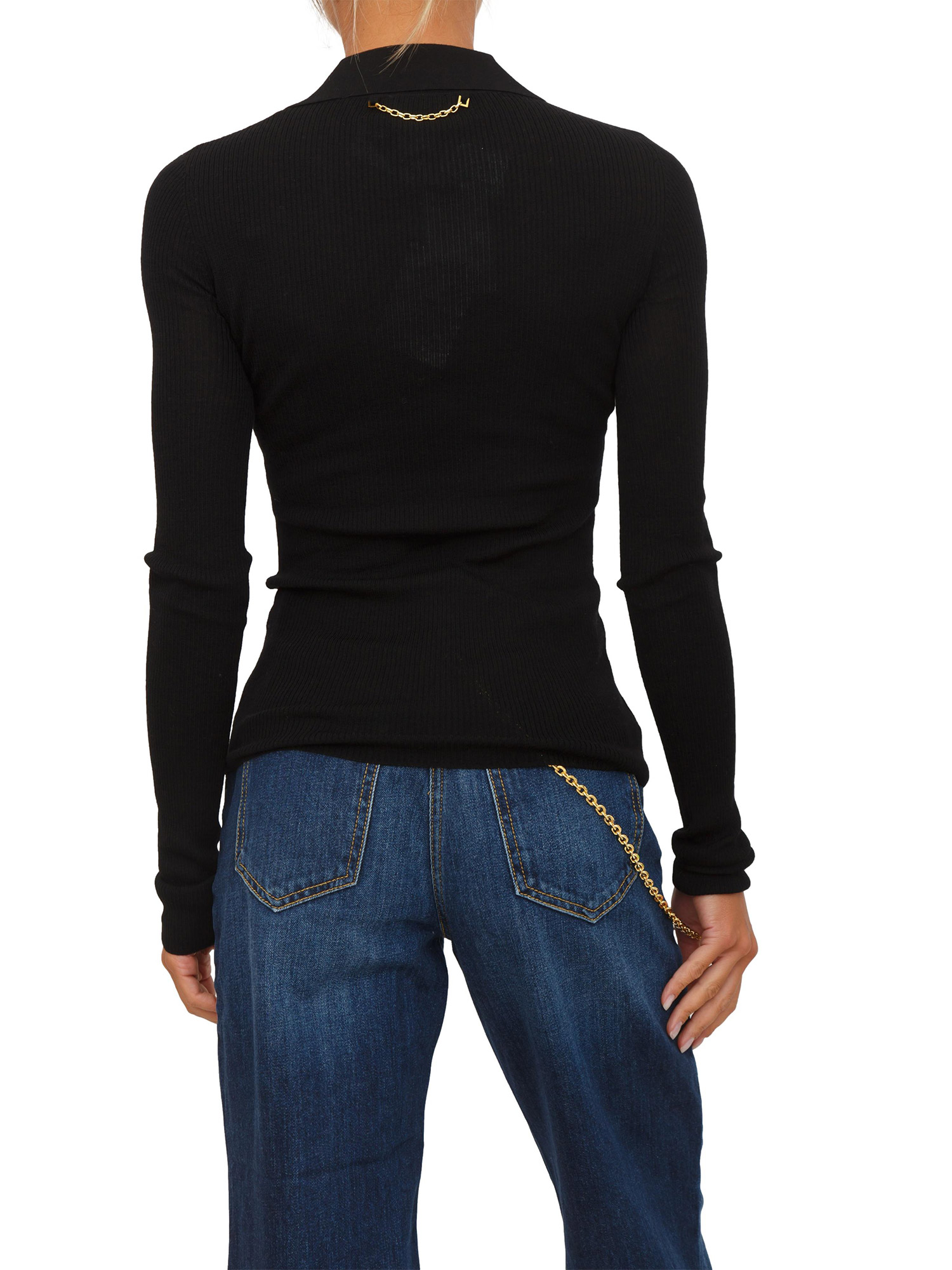 Brand: ELISABETTA FRANCHIPolo in maglia Elisabetta Franchi con vestibilità aderente. Rifinita a costine per una texture dinamica, ha colletto a polo e maniche lunghe con risvolto. Personalizzata da stampa lettering davanti e impreziosita dal luminoso dettaglio in catena sul retro del collo. La modella è alta 1.72 e indossa la taglia 42.