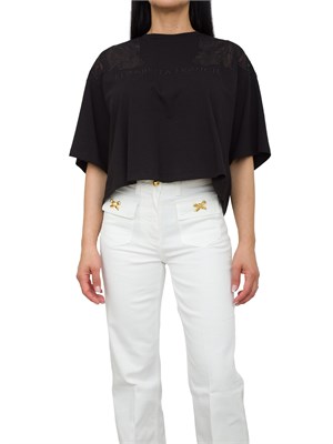 Brand: ELISABETTA FRANCHIT-shirt Elisabetta Franchi realizzata in pregiato cotone, dal design moderno e vestibilità over che risalta la silhouette. Grazie al suo inserto floreale tono su tono leggermente trasparente, dona un tocco romantico e stiloso al tuo look. Perfetta da abbinare a jeans o pantalone a vita alta e giacca per un look più grintoso.