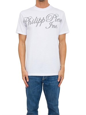 Brand: PHILIPP PLEINT-shirt realizzata in jersey di cotone, lettering del brand è stampato sul fronte, PP Hexagon su patch di pelle saffiano cucito sul carré, girocollo smacchinato a costina e i bordi sono rifiniti a due aghi.